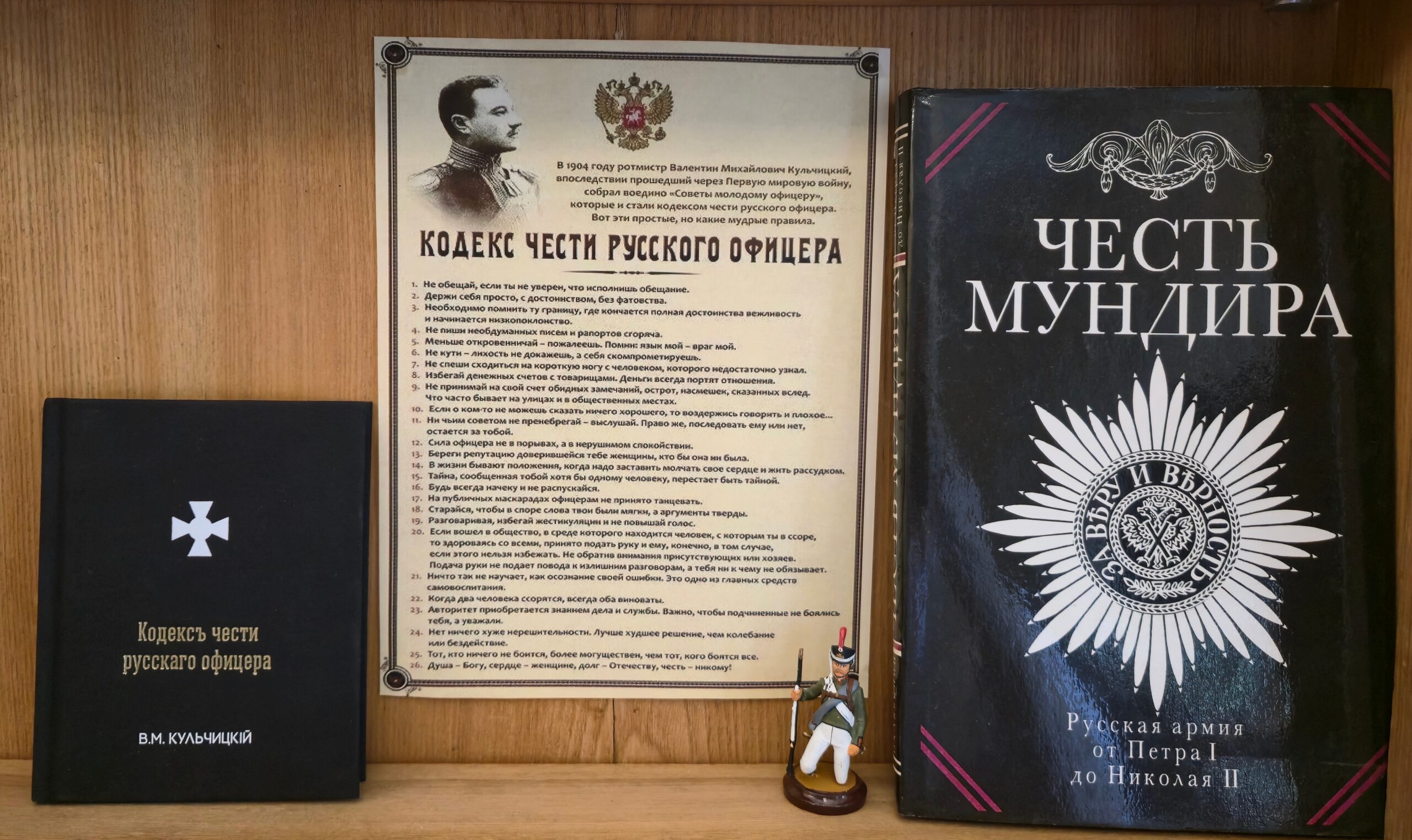 На выставке можно познакомиться с «Наукой побеждать» А.В. Суворова, книгой ротмистра В.М. Кульчицкого «Кодекс чести русского офицера» (2015), в которой собраны, по словам автора, «старые, но вечные истины, которые большинством забыты, а молодым офицерам – неизвестны».