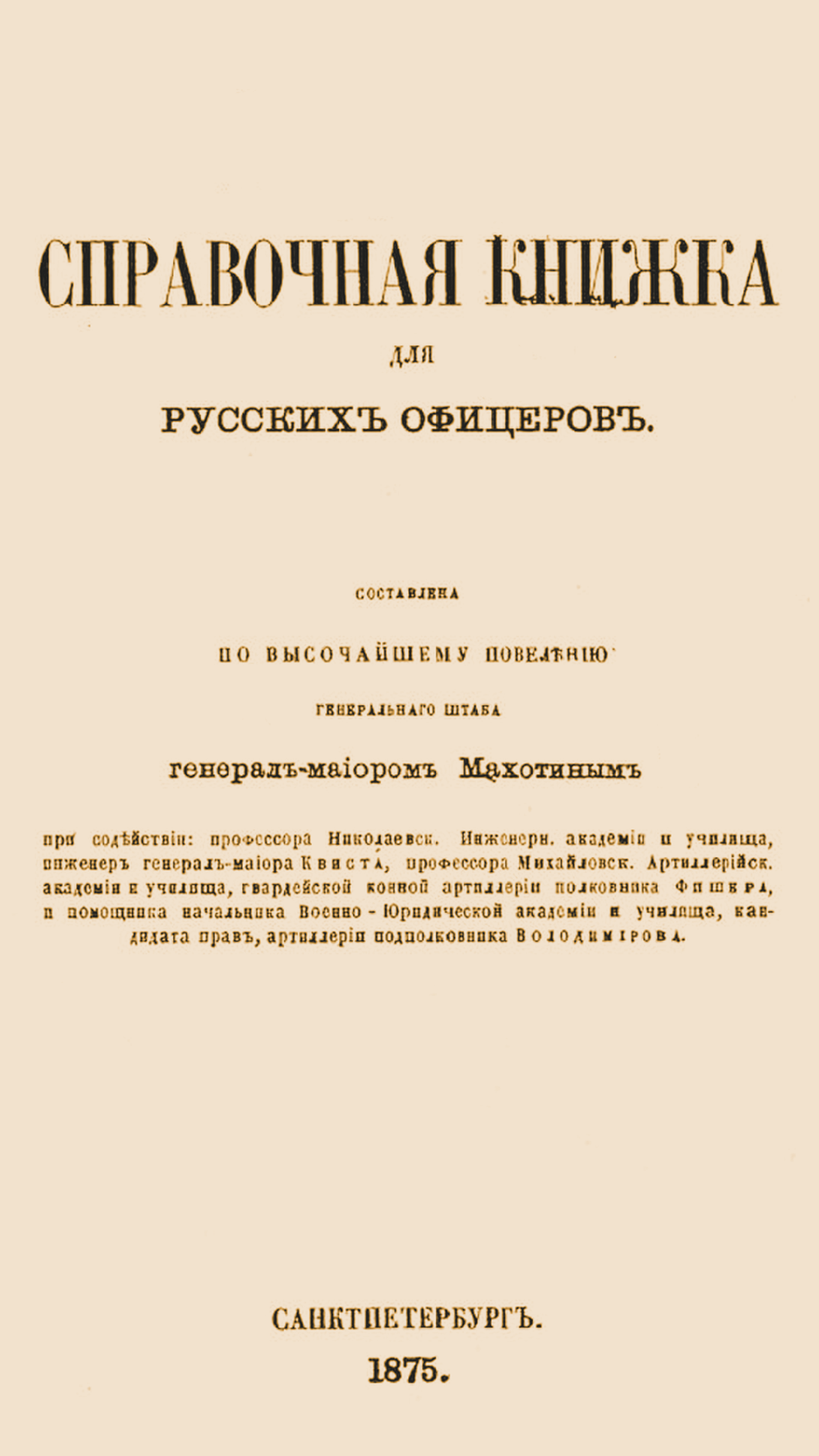 Развитие военной науки и практики в период военной реформы второй половины XIX века требовало обновленной справочной литературы соответствующей тематики. Издательская деятельность военного ведомства представлена на выставке не только энциклопедиями, но и малоформатными справочными пособиями. Особое признание в армии получила «Справочная книжка для русских офицеров» (1875), составленная генерал-майором Генерального штаба Махотиным и отнесенная к числу «самых необходимых настоятельных пособий для всякого офицера». До конца века данный справочник переиздавался несколько раз, сохраняя свою актуальность и универсальный характер. По свидетельству библиографа П. Бранта, эта книга «по своей полноте, отчетливости, тщательности издания превосходит все известные нам заграничные сборники, имеющие одинаковое с нею назначение».