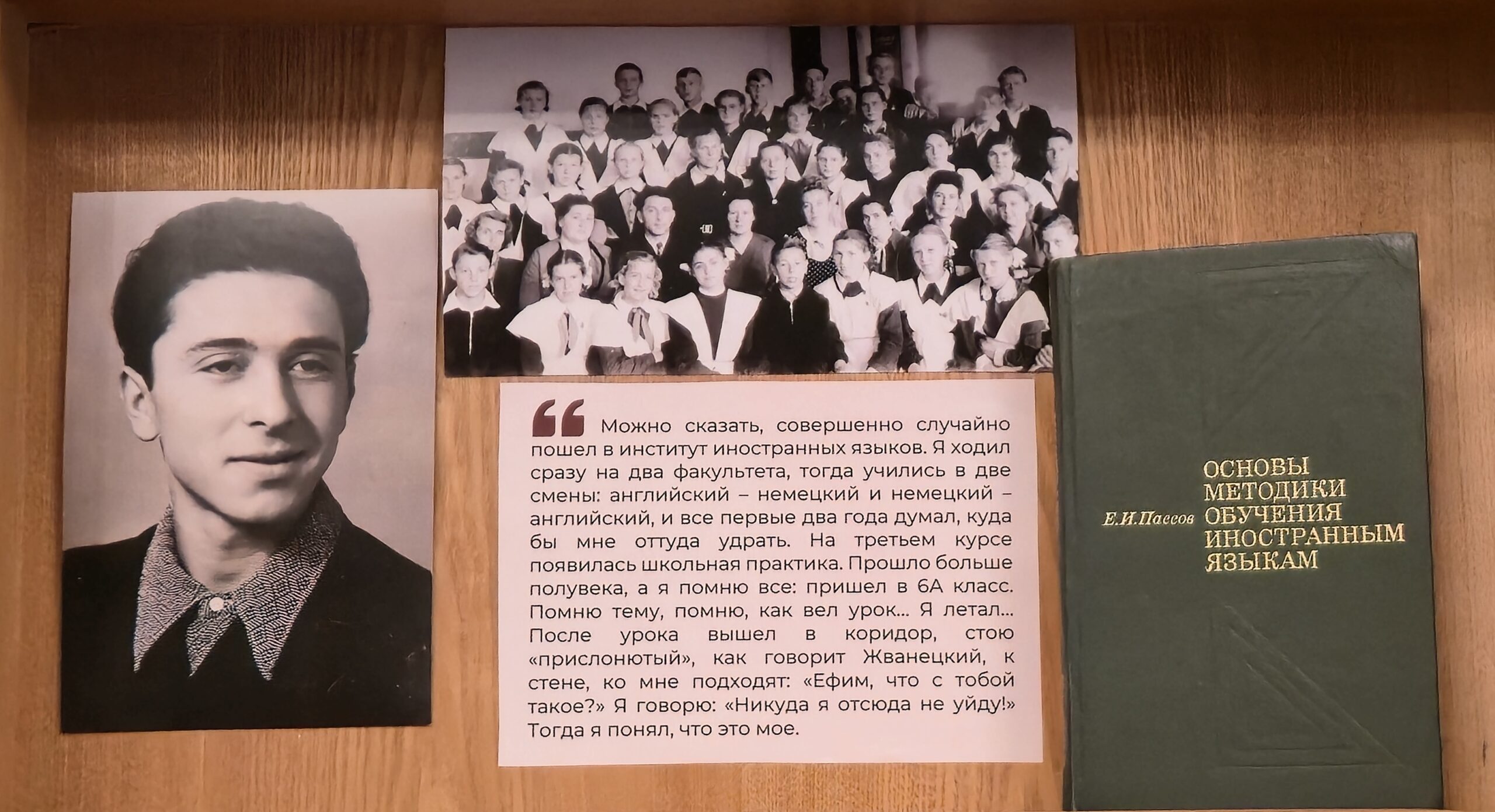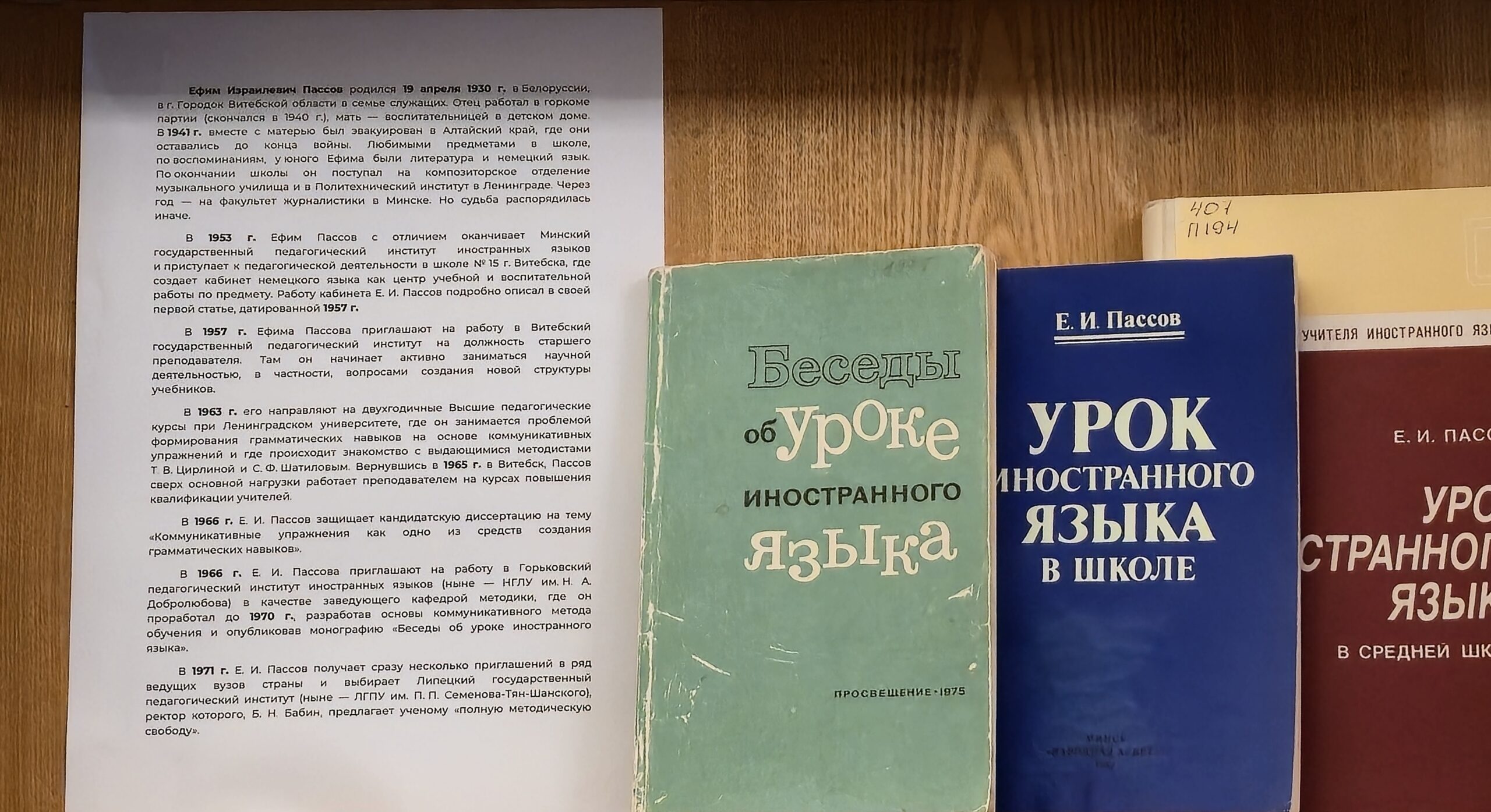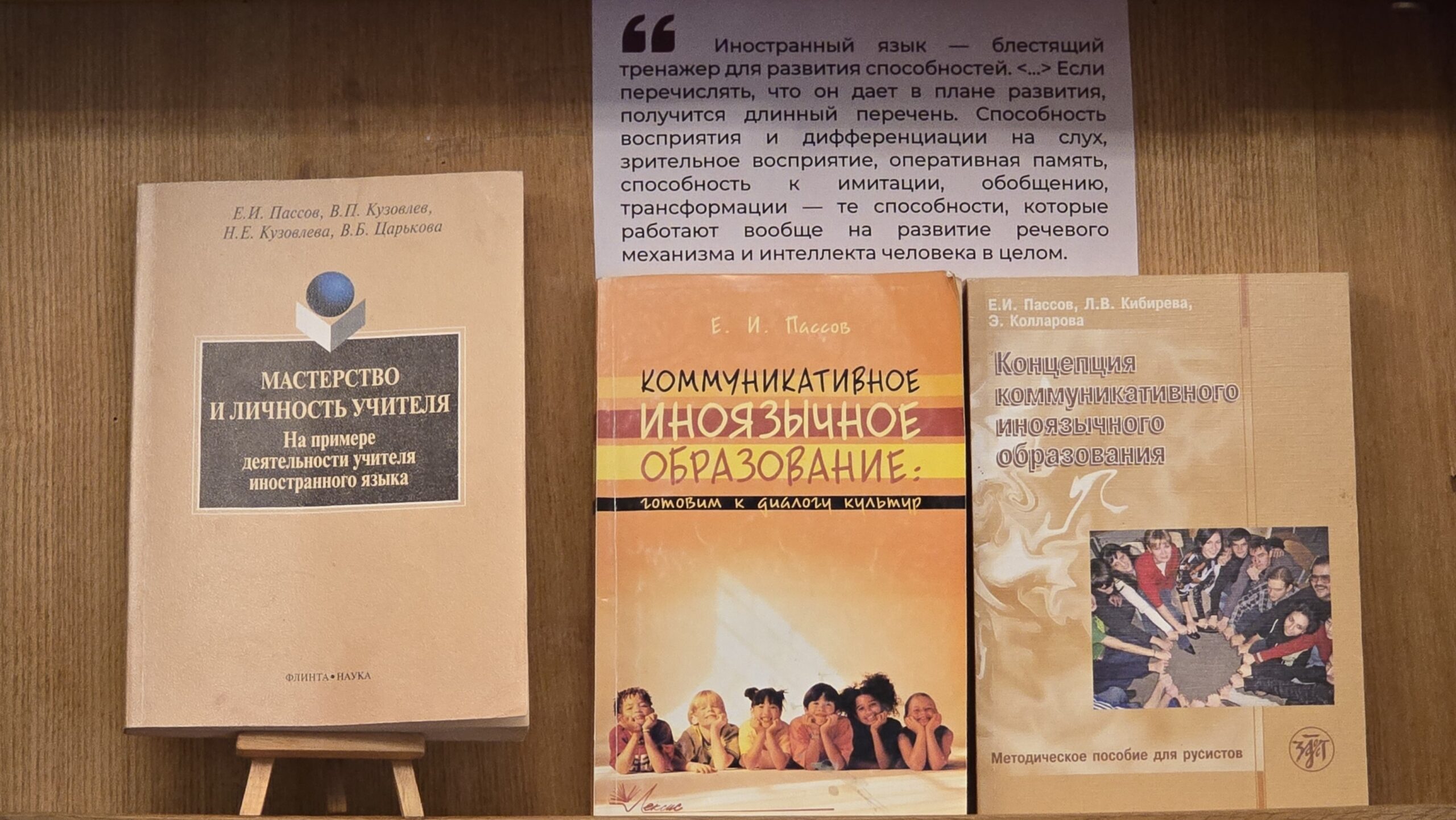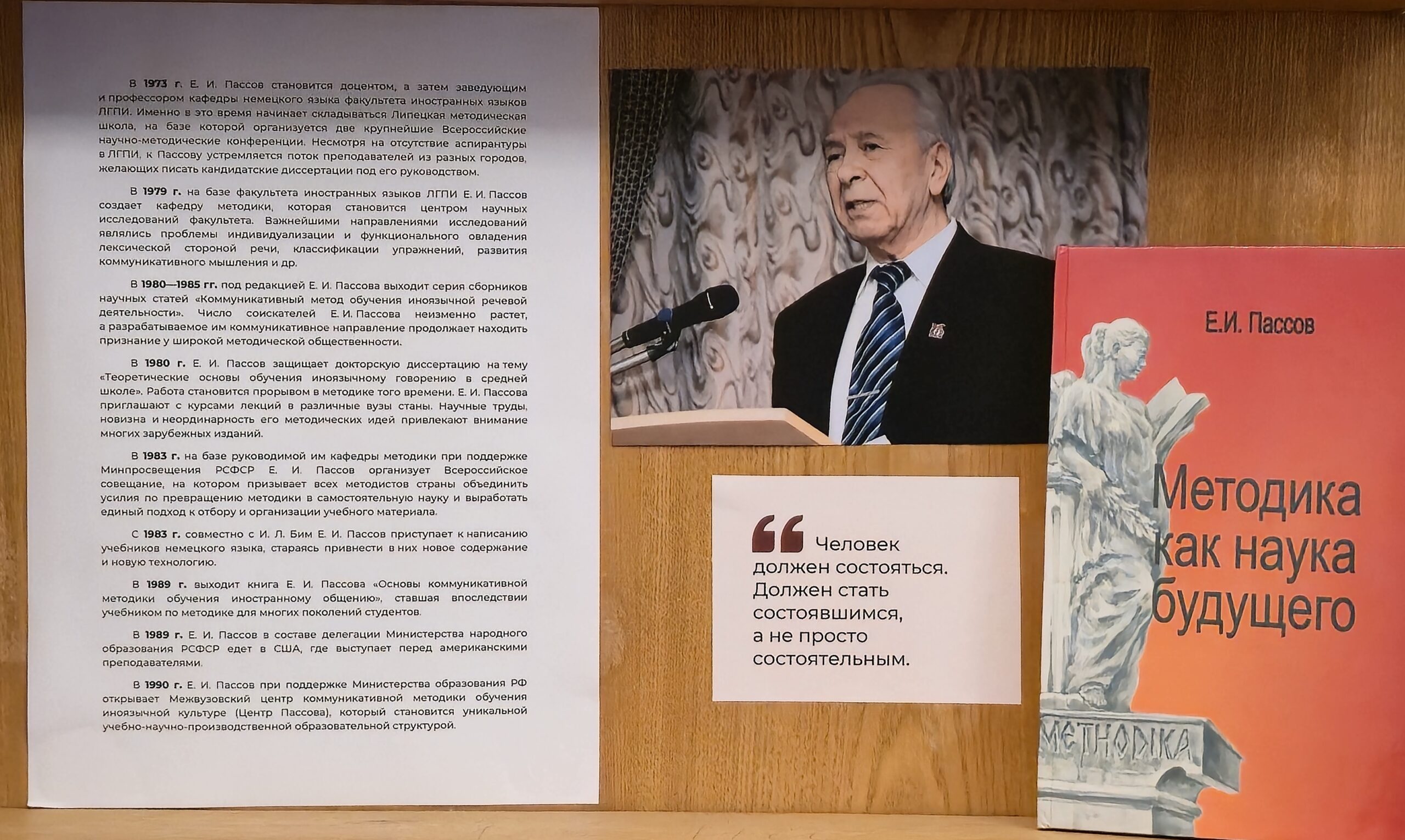 Выставка открыта в рамках информационной поддержки Всероссийской научно-практической конференции Пассовские чтения, посвященной 95-летнему юбилею известного российского ученого-методиста, заслуженного деятеля науки РФ, доктора педагогических наук, профессора Ефима Израиловича Пассова (1930-2019).